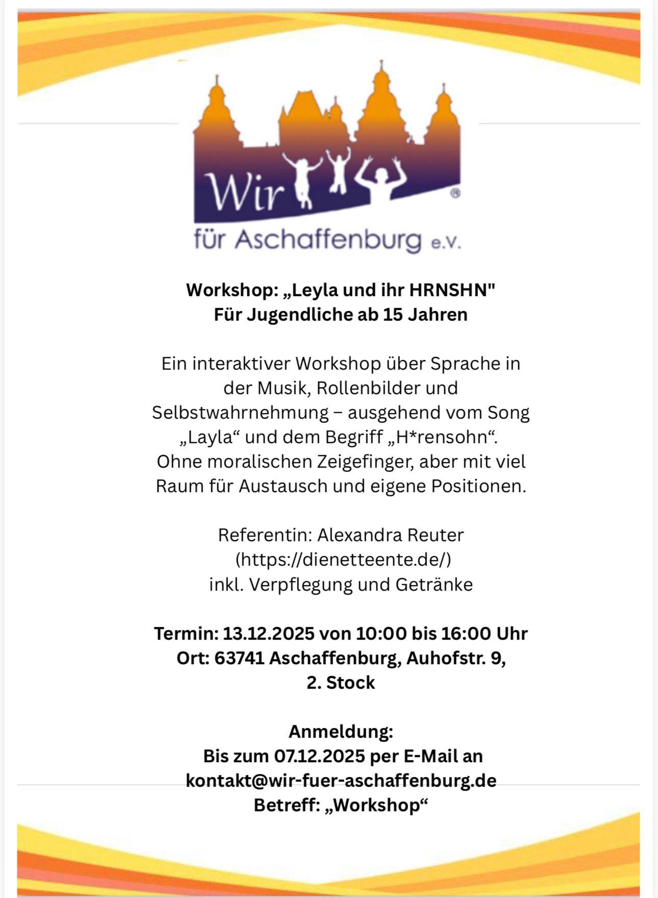 „Leyla und ihr HRNSHN“ ist ein interaktiver Workshop über Sprache in der Musik, Rollenbilder und Selbstwahrnehmung – ausgehend vom Song „Layla“ und dem Begriff H*rensohn. Ohne moralischen Zeigefinger, aber mit viel Raum für Austausch und eigene Positionen.